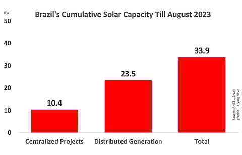 Brazil achieves solar capacity milestone: The National Electric Energy Agency (ANEEL) of Brazil says on August 31, 2023 the country's total installed centralized solar projects capacity reached 10.4 GW. It includes 744.7 MW installed in the month of August alone. Minas Gerais leads the states tally with 101 projects and 3.6 GW large-scale solar, followed by 2.1 GW in Bahia and 1.5 GW in Piaui. Solar energy now accounts for 5.27% of the nation's cumulative power generation capacity of 195.6 GW.