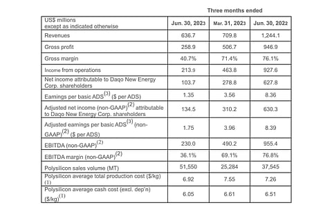 During the reporting quarter, the average selling price (ASP) for Daqo was $12.33/kg, compared to $27.83/kg in Q1/2023 (see Daqo New Energy Gets Mixed Bag In Q1/2023).