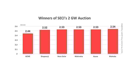 According to local daily The Economic Times (ET), the other winners were Shapoorji Pallonji that won 250 MW for 2.52 INR ($0.037) per kWh. Hero Solar Energy and Mahindra Susten won 250 MW each offering a tariff of 2.53 INR ($0.037) per kWh. Azure Power was another winner securing 600 MW capacity, also for 2.53 INR. ET reported that Adani's Mahoba Solar (UP) Private Limited won the remaining 50 MW for 2.54 INR ($0.037) per kWh.