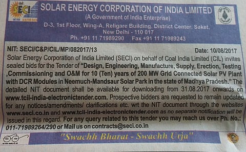 The Notice Inviting Tender (NIT) documents will be uploaded on CIL's tender website on August 31, 2017. SECI has only announced this tender through local news so far. It appeared in business daily, The Economic Times (ET) on August 10, 2017.