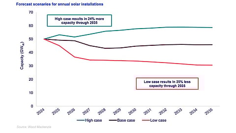 Presenting its 10-year outlook for every market segment, the report expects US solar capacity to more than triple from 236 GW DC at the end of 2024 to 739 GW DC by 2035-end. This means an average annual capacity addition of more than 45 GW DC.