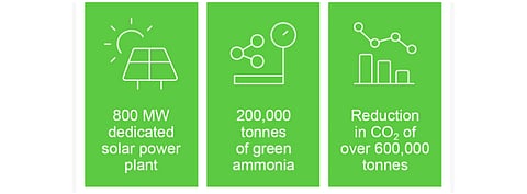 The facility is proposed to be powered by a dedicated 800 MW solar power plant within Kizad which would power a multi-MW electrolyzer plant and an ammonia production facility with a capacity of 20,000 tons annually, to be scale up to 200,000 tons per annum which will be produced by 40,000 tons of green hydrogen.