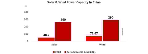 The National Energy Administration (NEA) of China has confirmed the country would target to grid connect a minimum of 90 GW of solar and wind power capacity in 2021, the 1st year of its 14th-Five-Year Plan. However, it doesn't specify the exact share for both. In 2020, China's annual PV capacity addition was 48.2 GW, while wind installed a record level of 71.67 GW, taking their cumulative installed capacity till April 2021-end to 260 GW and 290 GW, respectively (see China Installed 48.2 GW Solar PV Capacity In 2020).