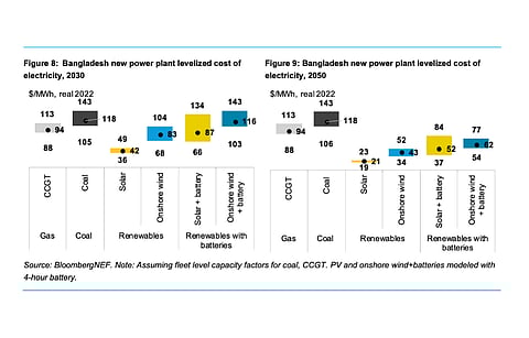BNEF in its report titled Bangladesh Power Sector at the Crossroads gives these estimates to show that building new thermal power plants and co-firing ammonia with coal and blending hydrogen with natural gas to reduce emissions will not be the best approach for the country to reduce emissions. Neither will it be cost-effective. In fact, it will pose significant financial risk for the country.