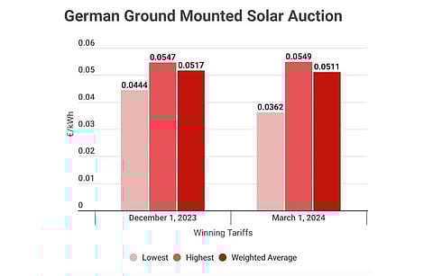 The March 1, 2024 German ground-mounted solar PV tender round of Bundesnetzagentur was oversubscribed with 569 bids representing 4,100 MW capacity, against the 2,231 MW offered. It eventually picked 326 bids for a total volume of 2.234 GW.