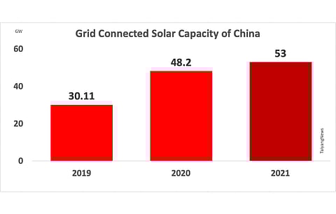 This is China's largest annual number for grid connected solar for any year to date. It represents an increase of around 10% on annual basis since 2020 additions were a total of 48.2 GW (see China Installed 48.2 GW Solar PV Capacity In 2020).