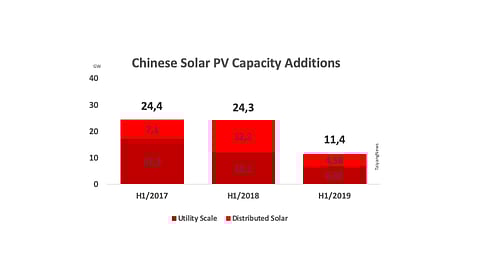 Between January 2019 and June 2019, China installed 11.4 GW of new solar PV capacity which came from 6.82 GW of large-scale solar and 4.58 GW of distributed solar PV, announced the country's National Energy Administration (NEA). This is a decline of 53% from 24.3 GW added in the first 6 months of 2018 (see China Installed 24.3 GW PV In H1/2018).
