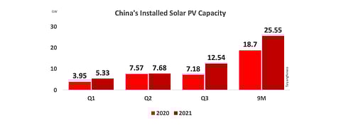 The National Energy Administration (NEA) of China says the country's cumulative installed solar PV capacity at the end of September 2021, exceeded 277.82 GW with the addition of 25.55 GW new solar within 9M/2021.
