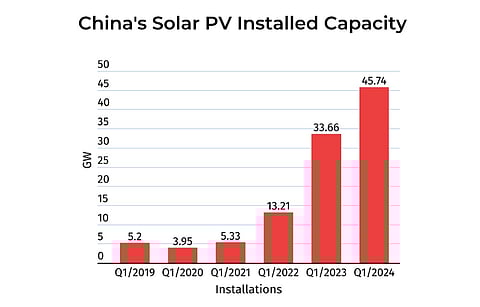 China's National Energy Administration (NEA) says the country's new solar PV installed capacity during the initial 3 months of 2024 rose by around 36% annually. The 45.74 GW new additions during the quarter saw an improvement of 12.08 GW over the previous year.