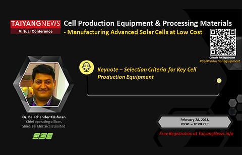 SSE at TaiyangNews Conference on Feb 28, 2023: Chief Operating Officer of Shirdi Sai Electricals Limited (SSE), Dr Balachander Krishnan, will be the keynote speaker for TaiyangNews Virtual Conference on Solar Cell Production Equipment & Processing Materials. He will be addressing the topic: Selection Criteria for Key Cell Production Equipment. SSE was on the 3 winners of Indias first Production Linked Incentive (PLI) solar tender. The Conference will take place on 28 February 2023 from 09.30-13.30 CET and will see speakers from eminent companies like DK Electronic Materials (DKEM), GS Solar, HANS PV , H2GEMINI, Leadmicro, SCHMID Group, Shirdi Sai Electricals Ltd; WAVELABS. For Agenda and free registration, click here.