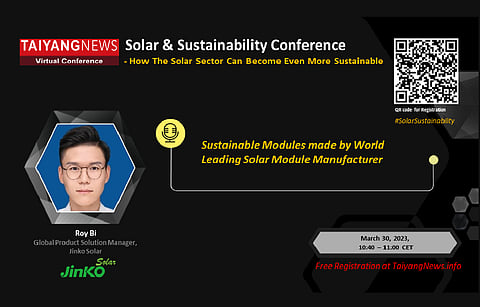 JinkoSolar at TaiyangNews Solar & Sustainability Conference: Roy Bi, Global Product Solution Manager, JinkoSolar will be speaking at Solar & Sustainability Virtual Conference hosted by TaiyangNews on March 30, 2023. The topic he will be speaking on is: Sustainable Modules Made by World Leading Solar Module Manufacturer. The Conference, which will take place from 9:30 – 13:15 CET, will look at solar & sustainability from different angles – corporate decarbonization strategies, low carbon vertically integrated module manufacturing and CO2 certification, to sustainable product sourcing, module recycling, and repowering of PV plants. Other esteemed solar PV stakeholders like LONGi, RISEN Energy, Baywa, Aquila Capital, TÜV Süd will also be present at the Conference. If you wish to join the Conference, register for free by clicking on this link.