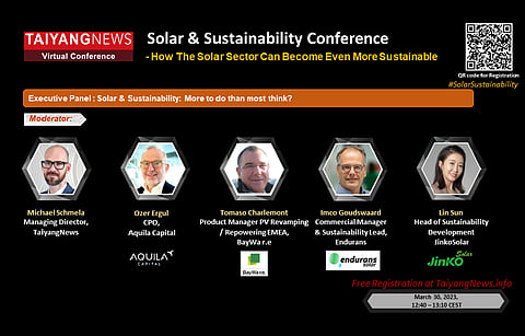 1 day left for TaiyangNews Solar and Sustainability Conference: Our 1st TaiyangNews Virtual Conference on Solar & Sustainability is just 1 day away. On March 30, the event, which includes presentations from various solar stakeholders, will also have an Executive Panel discussing the topic " Solar & Sustainability – More to do than most think?". Moderated by TaiyangNews Managing Director Michael Schmela the participants will be Ozer Ergul, CPO at Aquila Capital; Tomaso Charlemont, Product Lead PV Revamping / Repowering EMEA at BayWa r.e.; Imco Goudswaard, Commercial Manager & Sustainability Lead at Endurans; and Lin Sun, Head of Sustainability Development at JinkoSolar. To register for free, click here.
