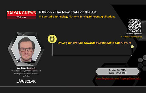 TOPCon – The New State of the Art Webinar on Oct. 16, 2023: TaiyangNews is hosting an exclusive webinar – TOPCon, The New State of the Art; The Versatile Technology Platform Serving Different Applications on October 16, 2023 from 10:00 – 11:30 CEST, where JA Solar's team will discuss the latest advances in TOPCon technology and explore how it is being used to develop new and innovative solar products.