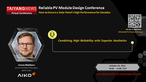 AIKO Solar's Jimmy Melskens to speak at TaiyangNews Reliable PV Module Design Conference: At the TaiyangNews Virtual Conference on Reliable PV Module Design, scheduled to take place on October 26, 2023 from 09:30 – 13:30 CEST, Jimmy Melskens, Senior Product Manager from AIKO Solar, will be speaking on the topic: Combining High Reliability With Superior Aesthetics.
