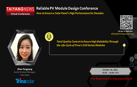 Trina Solar's Zhou Yangyang to speak at TaiyangNews Reliable PV Module Design Conference: Zhou Yangyang, Product Manager at Trina Solar, will be speaking at TaiyangNews Virtual Conference on Reliable PV Module Design, scheduled to take place on October 26, 2023, from 09:30 – 13:30 CEST. The topic she will be addressing is: Total Quality Control to Ensure High Reliability Thorough the Life-Cycle of Trina's Vertex n-Modules.
