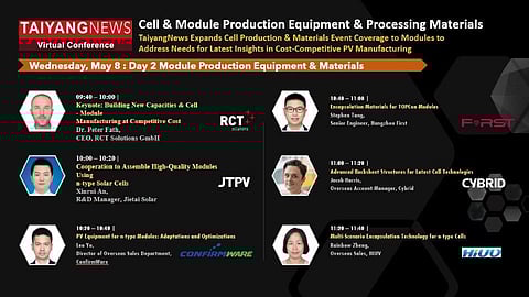 Day 2 of TaiyangNews Virtual Conference: The TaiyangNews Virtual Conference on Cell & Module Production Equipment & Processing Materials will resume tomorrow at 09:30 a.m. CET with a Welcome Note by Shravan Chunduri, Head of Technology, TaiyangNews. The Keynote address will be given by Dr. Peter Fath, CEO of RCT Solutions GmbH.