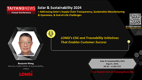 At the 2nd TaiyangNews Solar & Sustainability Conference, LONGi’s Benjamin Wong, Director, Public Affairs & Sustainability, will speak on the topic LONGi’s ESG and Traceability Initiatives That Enable Customer Success.