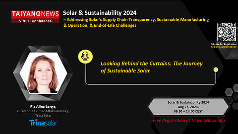 Pia Alina Lange, Director EU Public Affairs & Policy at Trina Solar, will be taking part in the TaiyangNews Solar & Sustainability 2024 Virtual Conference on August 27, 2024. She will be speaking on the topic – Looking Behind the Curtains: The Journey of Sustainable Solar.