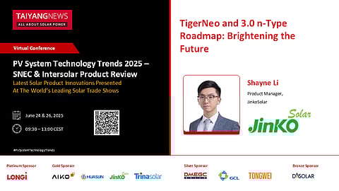Shayne Li, Product Manager at JinkoSolar, will be speaking on the topic TigerNeo and 3.0 n-Type Roadmap: Brightening the Future at the TaiyangNews Virtual Conference on PV System Technology Trends – SNEC & Intersolar Product Review.