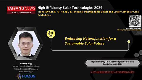 Kayn Huang, Senior Pre-Sales Technical and Product Support Manager at Huasun Energy, will shed some light on the topic: Embracing Heterojunction for a Sustainable Future, on Day 2 of the TaiyangNews Annual Flagship High-Efficiency Solar Technologies 2024 Virtual Conference, taking place on Dec. 2/3 & Dec. 10/11, 2024.