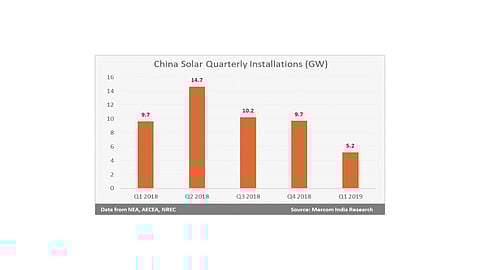 Referring to statistics shared by the Asia Europe Clean Energy (Solar) Advisory (AECEA) based on the country's National Renewable Energy Center (NREC), Mercom India Research says China installed 5.2 GW new solar in Q1/2019 with the majority being distributed solar PV projects. This is a drop of 46% YoY from 9.65 GW added a year back (see China Installed Record 9.65 GW PV In Q1/2018). However, China's Electricity Council claims around 3.49 GW of installations in Q1/2019.