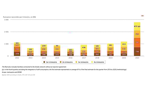 According to the SDES data, the annual additions for 2021 came in the form of 736 MW, 782 MW, 603 MW and 671 MW in the 4 quarters of last year, respectively, scoring a lead over 2020 when the total added up to 1.19 GW. It explains of the capacity installed in 2021, 66% corresponds to installations with over 250 kW capacity, however these formed less than 1% of new connections.