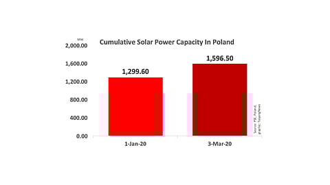 By March 1, 2020, installed solar power capacity in Poland went up to 1,596.5 MW or in round figures 1.6 GW, as per the country's grid operator Polskie Sieci Elektroenergetyczne (PSE). While announcing the milestone on its Twitter handle, PSE said this is an increase of 183.2% on annual basis and by '8.4% in the period I 2020-III 2020'.
