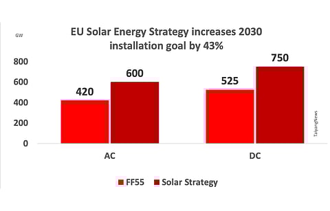 Converting the AC capacity to DC, under FF55 the bloc was targeting 420 GW AC/525 GW DC solar installations by 2030. Now under REPowerEU, it has been raised to around 600 GW AC/750 GW DC, representing an increase of 43%.