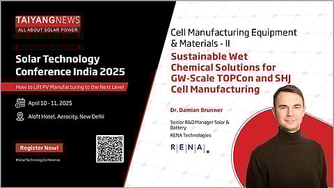 Solar PV manufacturing conference: One of the upcoming destinations for solar PV manufacturing beyond China is India, where companies are gathering support from technologists and scientists to develop an upstream value chain. The idea is not just to establish vertical integration but also to make it a resilient and sustainable one. TaiyangNews is bringing together the country’s leading solar PV players and international experts to discuss the progress of solar PV manufacturing in the Asian country in a 2-day physical event in New Delhi, India, on April 10 and 11, 2025. At the event, RENA Technologies’ Senior R&D Manager Solar & Battery, Dr. Damian Brunner, will talk about sustainable wet chemical solutions for GW-scale TOPCon and SHJ cell manufacturing. Registrations for the TaiyangNews Solar Technology Conference India 2025 are now open here, where you can take a look at the list of speakers and insightful sessions planned.