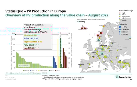 Currently, all of Europe (excluding Turkey and Russia) has a cumulative installed annual production capacity of 8.28 GW for modules, 760 MW for cells, 1.40 GW for ingot and wafer, 22.1 GW polysilicon and 38.2 GW metallurgical grade silicon (mg-Si). In comparison, European Union alone is targeting 600 GW AC installed solar capacity by 2030 (see EU Announces 600 GW AC Solar Target By 2030).