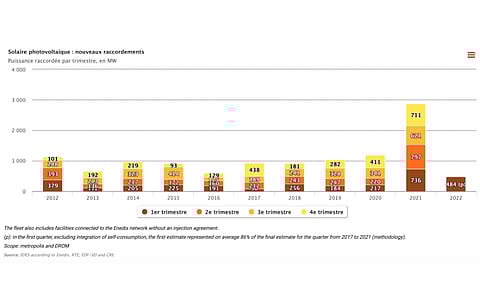 Of the newly connected capacity, 65% of the total came up in the regions of Nouvelle-Aquitaine, Occitanie, Auvergne-Rhône-Alpes and Provence-Alpes-Côte d'Azur.