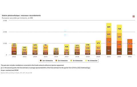 The share of solar power systems for self-consumption is also on the rise as SDES analysts claim, "In the first half of 2023, 41.6% of photovoltaic installations (8.5% of installed power) produce electricity which is entirely or partially self-consumed. The share of these installations is up 1.2 points compared to the previous quarter. In the second quarter of 2023, 297 GWh of photovoltaic electricity was self-consumed by producers, or 3.9% of the quarter's photovoltaic production. Total self-consumption installations produced 112 GWh, or 38% of the total self-consumption."