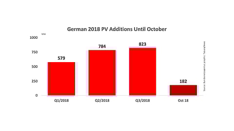 Germany's Federal Network Agency's (Bundesnetzagentur) update about October 2018 PV installations show that the EU's largest solar market added 182.054 MW of new capacity, including 13.111 MW of ground-mounted PV. That's less than the 198 MW added in the previous month of September 2018 (see Germany Installed Over 198 MW In Sept 2018), but more than the around 149 MW installed in October 2017 (see Germany Adds 116 MW In November).
