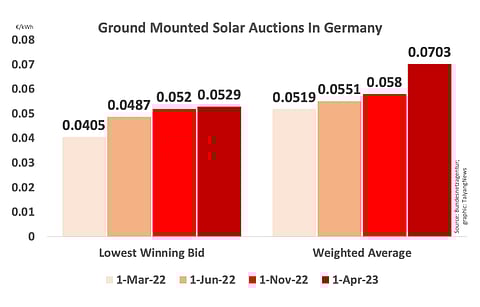 Winning tariffs ranged between €0.0529/kWh as lowest and €0.0730/kWh as highest with an average weighted of €0.0703/kWh. In the previous round held on November 1, 2022, tariffs were determined as €0.0520/kWh, €0.0590/kWh and €0.0580/kWh respectively, which means the lowest bids remained at basically the same level, while the maximum is much higher now (see Another Undersubscribed Solar Auction In Germany).