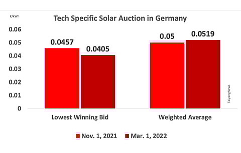 The average weighted winning bid of €0.0519 per kWh rose from €0.05 per kWh recorded in the previous round held on Nov. 1, 2021, while lowest and highest bids ranged between €0.0405 to €0.0555 per kWh (see Germany's 3rd Tech. Specific Auction 2021).