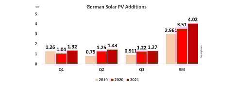 Germany's Bundesnetzagentur has released the solar PV registration data in the country for the month of September 2021 as 406.39 MW, taking the country's 9M/2021 additions to 4.023 GW. A year back, during 9M/2020 the country installed over 3.5 GW.