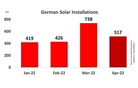 Germany's energy regulator Bundesnetzagentur or Federal Network Agency says in the month of April 2022 it registered 517 MW of new solar PV capacity, which takes the total installed solar power capacity in the country during 4M/2022 to 2.099 GW.