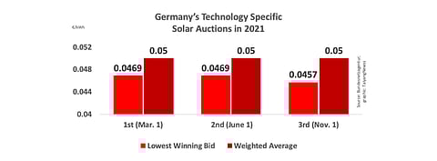 Germany has awarded 512 MW new solar capacity selecting 133 bids for the country's 3rd technology specific solar energy auction for 2021, with the lowest winning bid determined as €0.0457 per kWh, said the country's Federal Network Agency (Bundesnetzagentur). Bids for this round, launched in June, were capped at €0.059 per kWh.