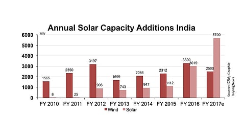 In March 2016, ICRA had predicted the country will add 2.7 GW of solar power capacity, and in 2016-17 it will add 5.7 GW (see ICRA estimates 5.7 GW of solar by 2017 in India). This will also be the first year since 2011 when solar capacity addition is expected to be higher than wind power, which so far has always stayed above PV in India. ICRA says wind will add only 2.5 GW in 2016-17, down from 3.3 GW added in the previous year.