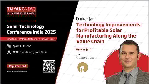 Solar PV manufacturing conference: One of the upcoming destinations for solar PV manufacturing beyond China is India, where companies are gathering support from technologists and scientists to develop an upstream value chain. The idea is not just to establish vertical integration but also to make it a resilient and sustainable one. TaiyangNews is bringing together the country’s leading solar PV players and international experts to discuss the progress of solar PV manufacturing in the Asian country in a 2-day physical event in New Delhi, India, on April 10 and 11, 2025. Omkar Jani, the CTO of Reliance Industries, will be in attendance at the conference as part of the executive panel, where he will share insights on technology improvements for profitable solar manufacturing along the value chain. Registrations for the TaiyangNews Solar Technology Conference India 2025 are open now here, where you can take a look at the list of speakers and insightful sessions planned.