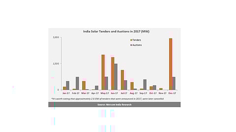 2017 saw over 9.5 GW of solar power capacity tendered by government agencies in India. However, there were also cancellations, amounting to 2.6 GW during the year. Total auctioned capacity during the year was 6 GW, according to Mercom India Research.
