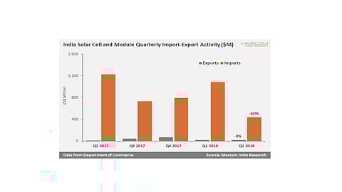 In its yet to be released Mercom India Q2 Quarterly Market Report, the Indian clean energy consultancy says, that during Q2/2018, solar modules and cells worth $436.6 million were imported in the country, as against $1 billion imported in the previous quarter. China that has a stronghold in the Indian solar market with its deluge of imports bore the brunt of the slowdown. Mercom's records show Chinese companies accounted for nearly 75.9% of the country's imports in Q2/2018 (CY), down from more than 90% sequentially.
