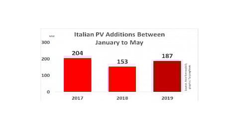 Italy added 187 MW of solar power capacity in the first 5 months of 2019, according to Italian renewable energy association Anie Rinnovabili. This is an increase of 22% over the same period in 2018, it said. In Q1/2019, the country installed 105 MW in total (see 105 MW New Solar For Italy In Q1/2019).
