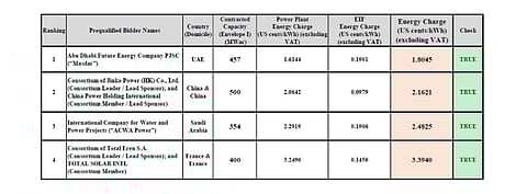 A consortium led by China's Jinko Power (HK) Co., Ltd., and China Power Holding International have offered to build 500 MW PV capacity for $0.021621 per kWh. ACWA Power of Saudi Arabia has quoted $0.024825 per kWh to build 354 MW capacity, while French consortium of Total Eren and Total Solar International want to develop 400 MW capacity for $0.033940 per kWh.