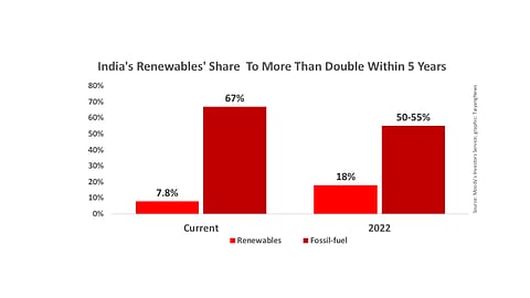 By 2022, when India aims to have 175 GW of installed renewable energy capacity with 100 GW coming from solar, renewable energy's share in the total energy mix is expected to be around 18%, increasing from 7.8% at the end of March 2018. Fossil-fuel based power generation capacity will witness a fall to 50% to 55% from the current 67%. Partly, it will be due to wind and solar power tariffs either achieving parity or being lower than domestic coal-based generation, said Moody's Vice President and Senior Analyst, Abhishek Tyagi.