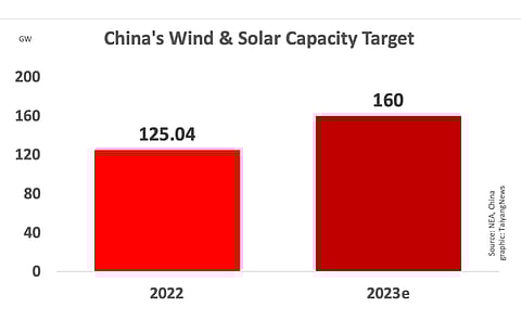 The National Energy Administration (NEA) in China has announced the country will target to install 160 GW of new solar PV and wind energy capacity in 2023, increasing the installations for these 2 power generation sources by 28% from 125.04 GW in 2022.
