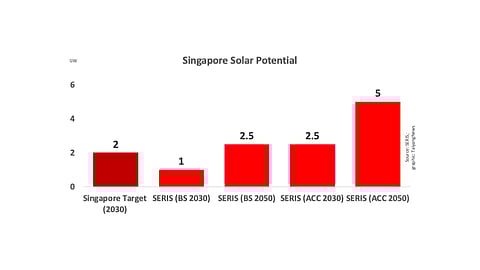 Singapore is aiming to deploy at least 2 GW of solar energy by 2030. In this updated study, the technical potential of solar in the country is estimated at 1 GW by 2030 and 2.5 GW by 2050 under a baseline scenario (BS), and under the accelerated scenario (ACC) it has been updated to 2.5 GW by 2030 and 5 GW by 2050. The ACC, claims the study, would mean solar power would account for 22% of the total energy generation mix of Singapore on power level by 2030 increasing to 43% by 2050.