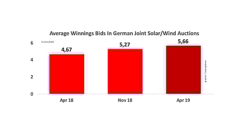 Even earlier in April 2018, during the first joint wind and solar auction, solar won all 210 MW with an average winning bid of €0.0467 ($0.058) per kWh (see All For Solar, None For Wind In German Tender).