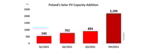 With the addition of around 540 MW in Q1/2021 and 762 MW in Q2/2021, along with 894 MW the country added during Q3/2021 alone, Poland installed well over 2 GW within 9M/2021 (see Poland Exceeds 5 GW Cumulative Solar Power Capacity).