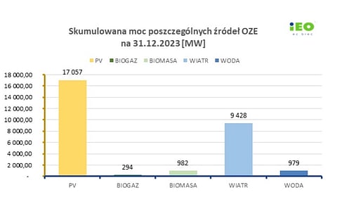 The cumulative PV capacity of Poland makes up the lion's share among other renewable energy sources. According to IEO, wind installations added up to 9.4 GW, hydropower 949 MW, biomass 982 MW and biogas 294 MW at the end of 2023.